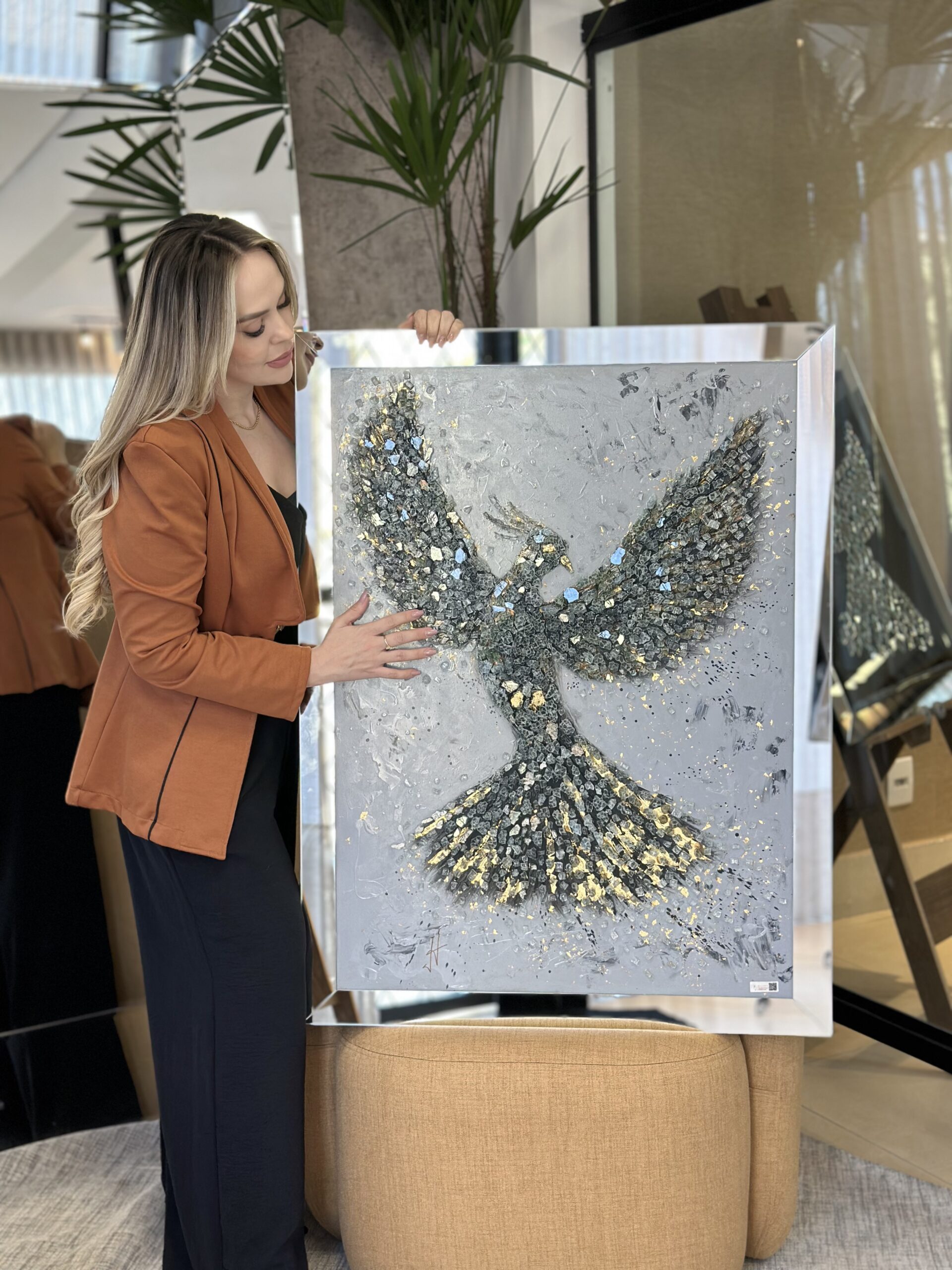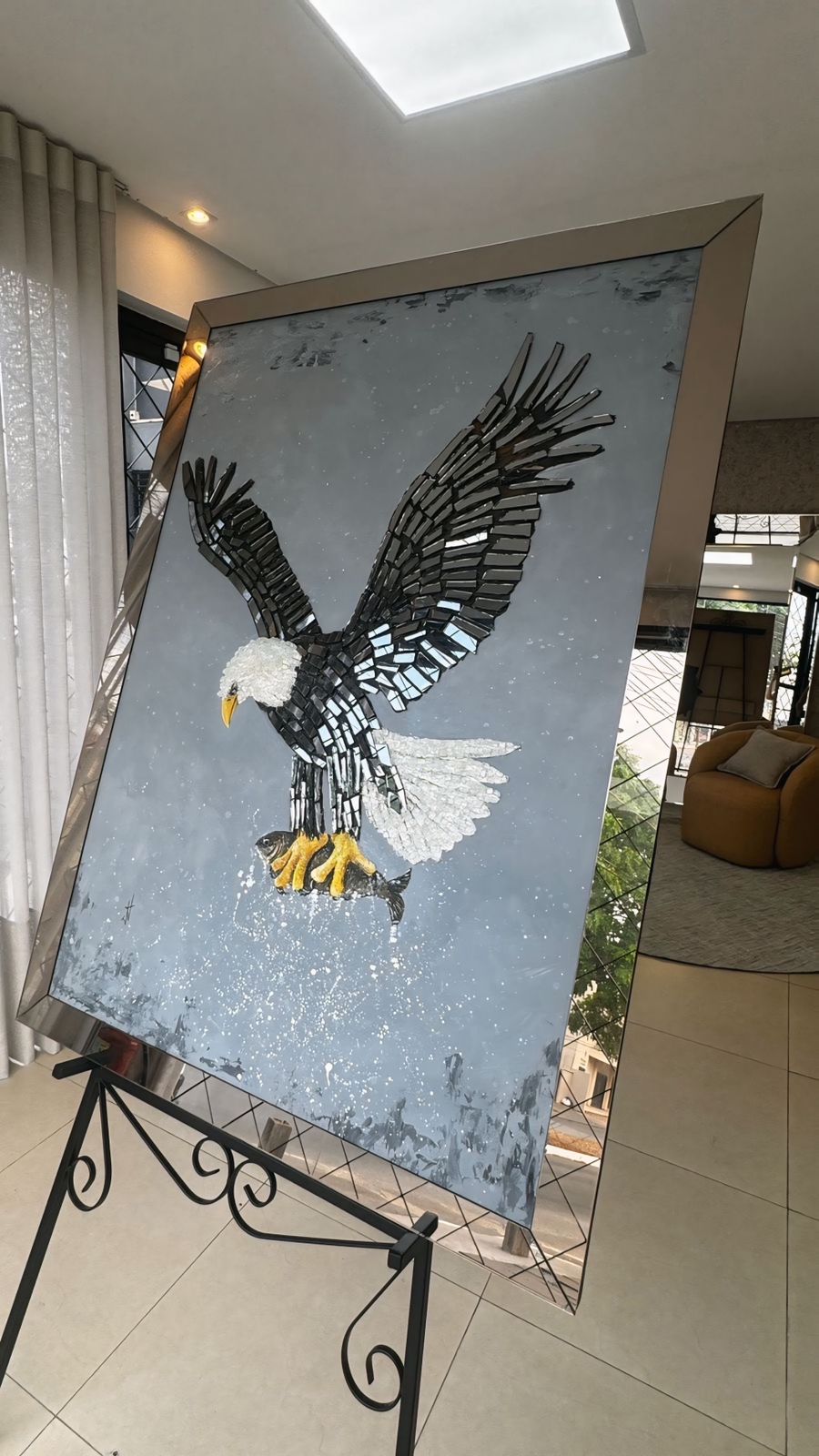 Composta por técnicas especiais de arte plástica e cacos de vidro, ela simboliza a força, resiliência e transformação de quem decide se levantar mais forte após cada queda. ✨🦅