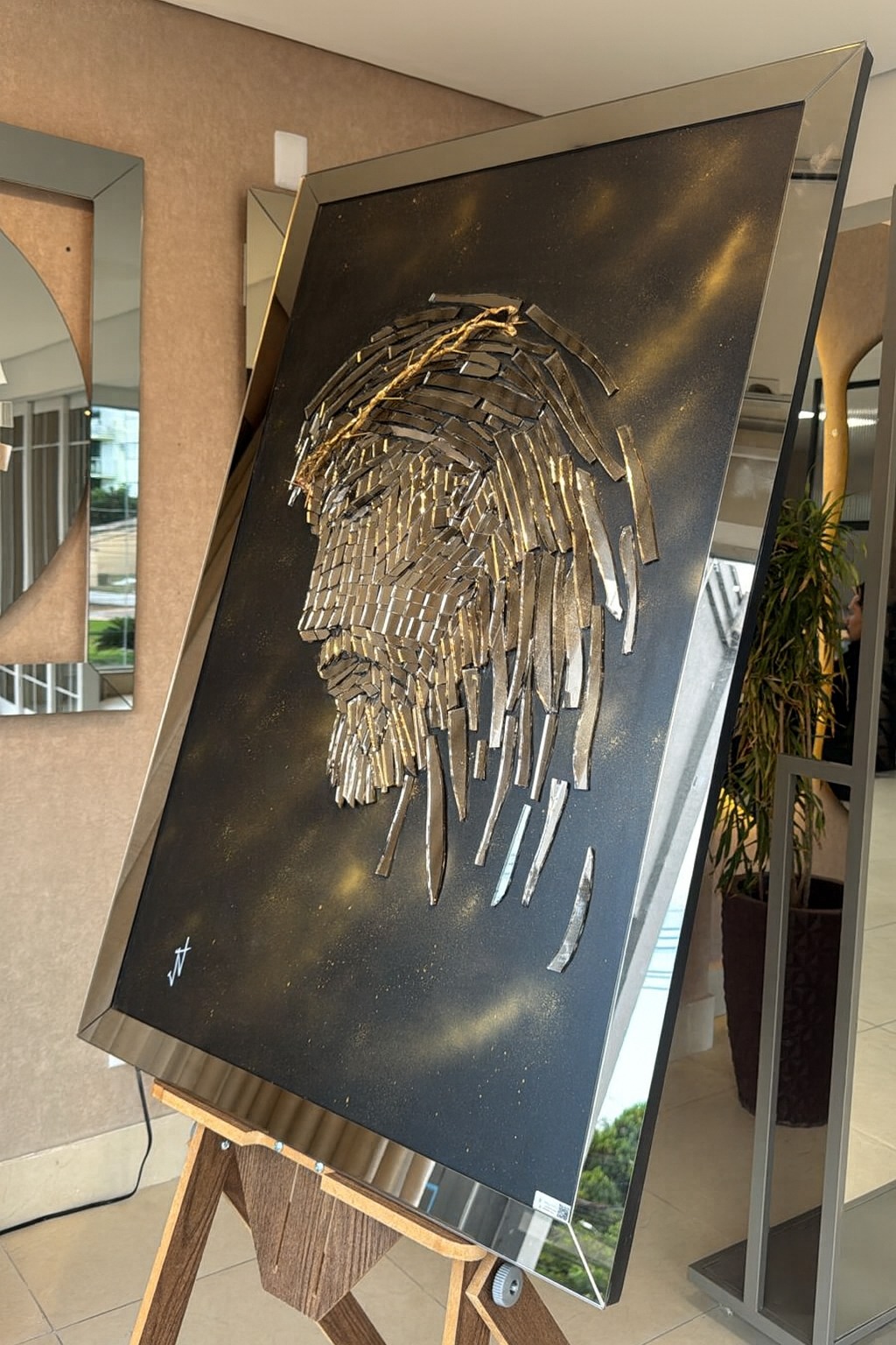 Feita inteiramente com cacos de espelhos bronze, ela carrega um simbolismo profundo: o reflexo quebrado que, ao ser reconstruído com propósito e sensibilidade, se transforma em algo divino. Cada fragmento representa as imperfeições humanas, reunidas em harmonia para formar a imagem de Jesus, aquele que nos restaura e nos refaz por completo. 🙏